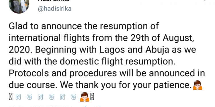 The Minister of Aviation, Hadi Sirika has announced that International flights will resume in Nigeria from Saturday, August 29, 2020.