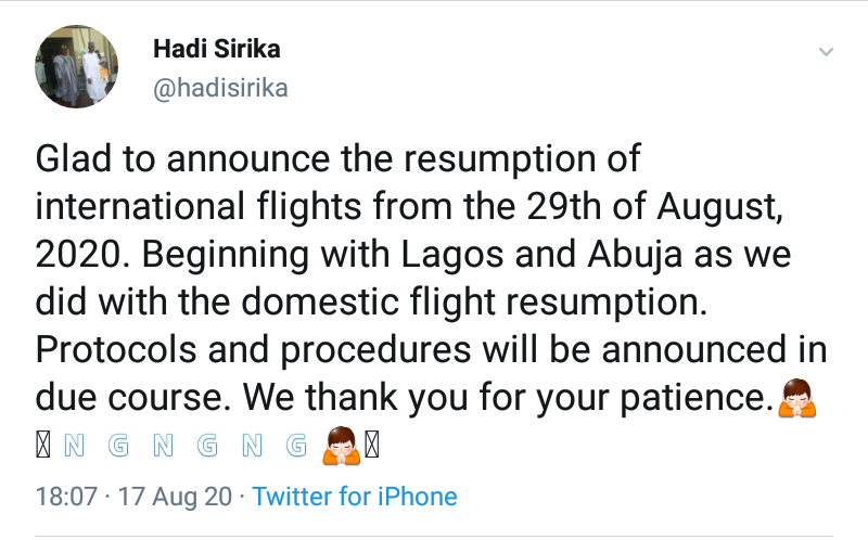 While announcing the resumption, Sirika tweeted: ”Glad to announce the resumption of international flights from the 29th of August, 2020. Beginning with Lagos and Abuja as we did with the domestic flight resumption. Protocols and procedures will be announced in due course. We thank you for your patience.”