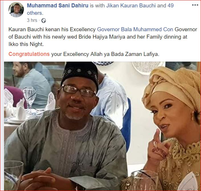 Bauchi State Governor, Bala Mohammed, wedded his second wife, Natasha Mariana, a Lebanese-Nigerian woman at the Syrian mosque in Ikoyi, Lagos, Southwest Nigeria on Friday.