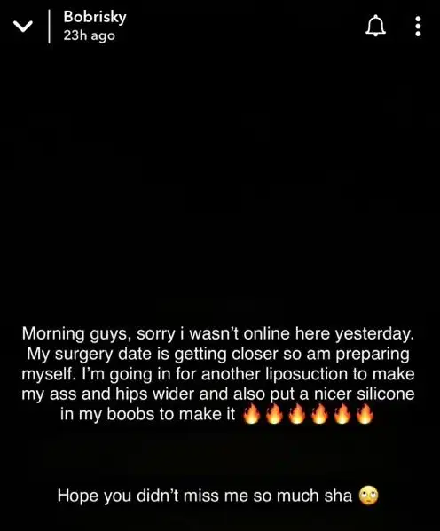 In a post on his official Snapchat page, Bobrisky announced that his liposuction surgery date is very close, hence his time off social media.