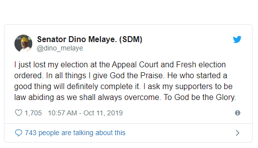 Confirming the news, Dino Melaye Tweeted, ‘I just lost my election at the Appeal Court and Fresh election ordered. In all things I give God the Praise. He who started a good thing will definitely complete it. I ask my supporters to be law abiding as we shall always overcome. To God be the Glory’.