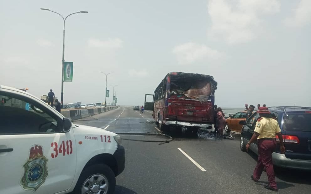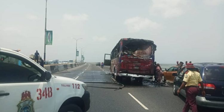 A BRT bus Wednesday morning caught fire on the Third Mainland Bridge, Lagos.