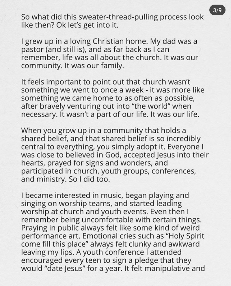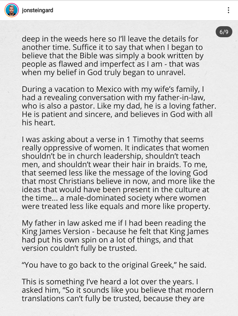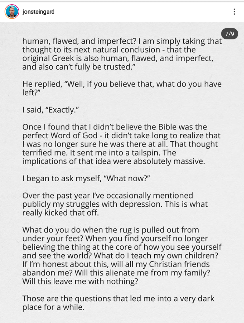 Steingard wrote: I’ve been terrified to post this for a while – but it feels like it’s time for me to be honest. I hope this is not the end of the conversation, but the beginning. I hope this is encouraging to people who might feel the same but are as afraid to speak as I am. I want to be open. I want to be transparent with you all – and also open to having my heart changed in the future. I am not looking for a debate at all – just a chance to share my story in the hopes some good can come from it. I love you all.”