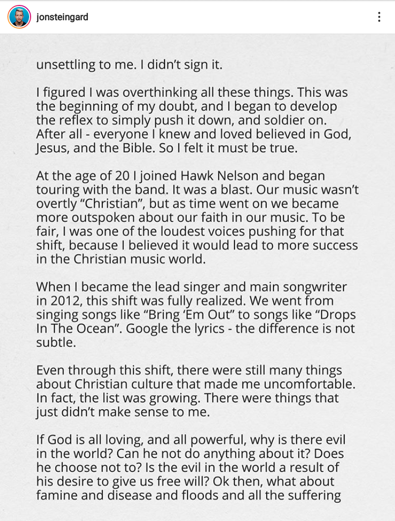 Canadian gospel musician, Jonathan Steingard says he no longer believes in God