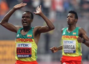 Ethiopia’s Muktar Edris celebrates after winning in the Men’s 5000m final at the 2019 IAAF Athletics World Championships at the...