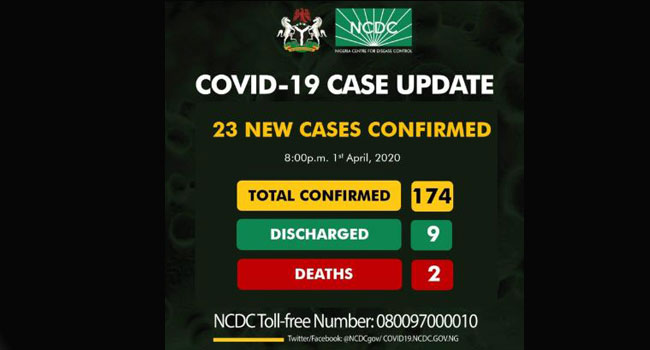 As at 08:00 pm 1st April there are 174 confirmed cases of #COVID19 reported in Nigeria. Nine have been discharged with two deaths pic.twitter.com/Wy9MzX1lsr