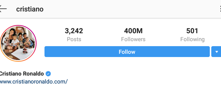 With 3242 posts, Ronaldo has an average of 10 million ‘likes’ for each post and only follows 500 users.