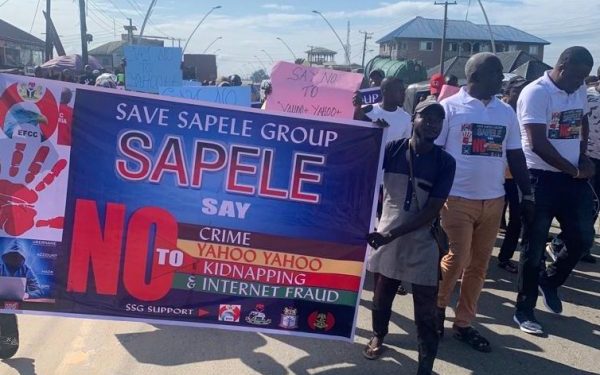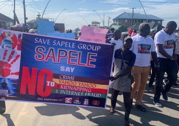 The Youth of the Save Sapele Group, marched through the streets of sapele with banners and placards bearing various messages such as “Sapele Say No to Crime, Yahoo Yahoo, Kidnapping and Internet Fraud”, “Say No to Corruption”, “Protect our Youths, Daughters and Sisters – Say No to Yahoo Yahoo” and ” Say No to 419″