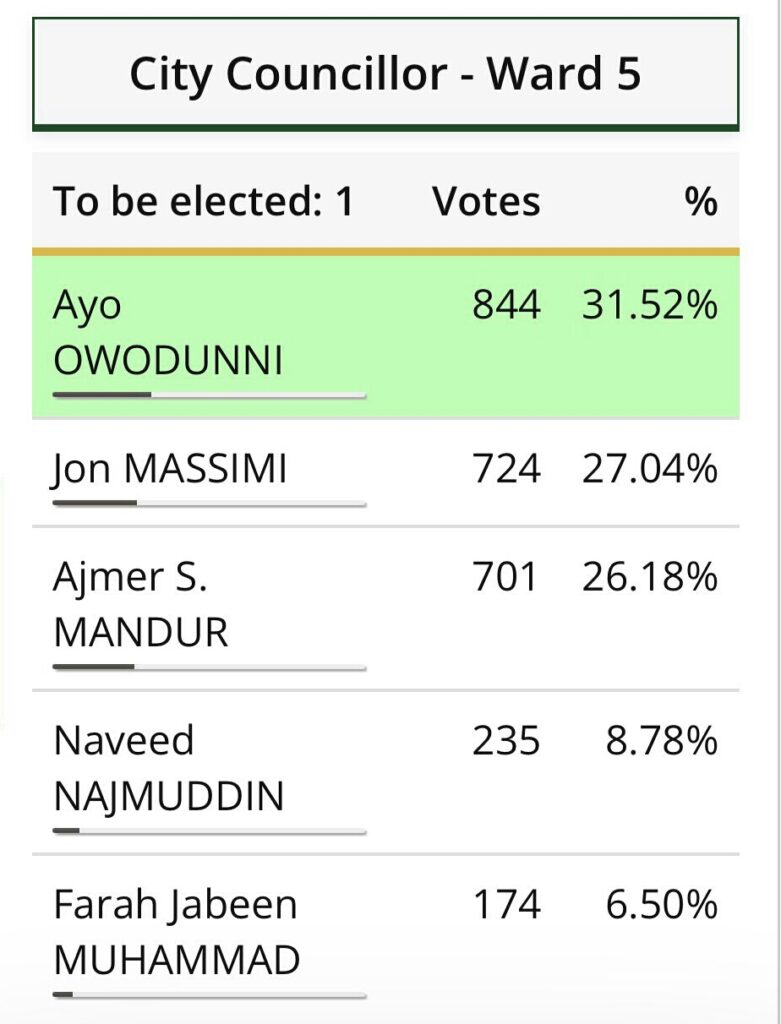 Nigerian-born Ayo Owodunni has been elected as city Councillor in Kitchener, Ontario.