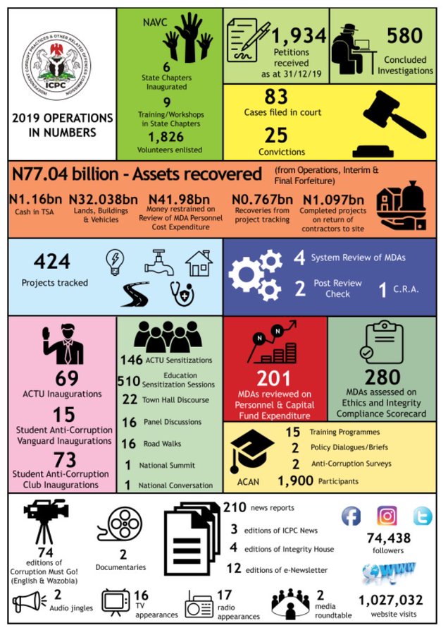 N77.04 billion worth of stolen assets was recovered in the year 2019; so said the Independent Corrupt Practices and Other Related Offences Commission (ICPC).