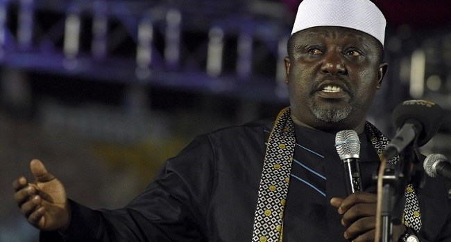 Presidential aspirant of the All Progressives Congress (APC) Rochas Okorocha speaks during the presidential primary of the party in Lagos on December 11, 2014. Members of Nigeria's main opposition party voted through the night to choose a candidate to challenge President Goodluck Jonathan at next year's elections, with a result expected later on December 11. AFP PHOTO / PIUS UTOMI EKPEI