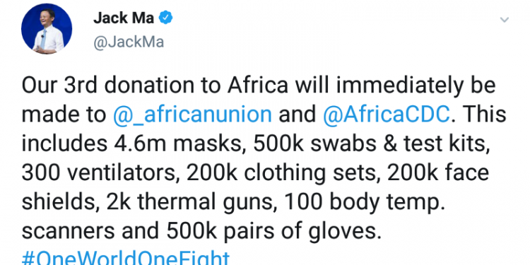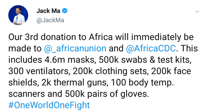 He Tweeted: “Our 3rd donation to Africa will immediately be made to @_africanunion and @AfricaCDC. This includes 4.6m masks, 500k swabs & test kits, 300 ventilators, 200k clothing sets, 200k face shields, 2k thermal guns, 100 body temp. scanners and 500k pairs of gloves. #OneWorldOneFight”