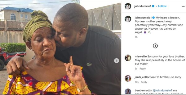 Dumelo, who often features in Nollywood movies, announced the death of his mother in a recent Instagram post.
