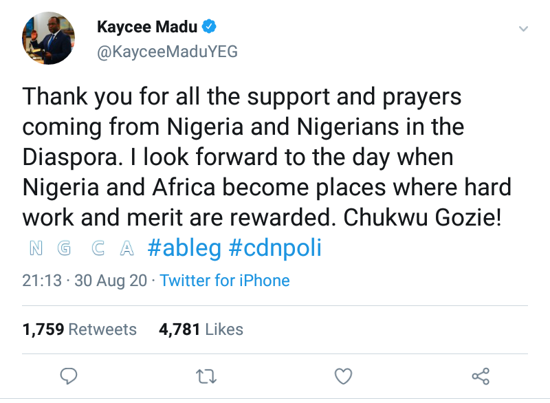 While thanking Nigerians for the support, he tweeted: “Thank you for all the support and prayers coming from Nigeria and Nigerians in the Diaspora. I look forward to the day when Nigeria and Africa become places where hard work and merit are rewarded. Chukwu Gozie! #ableg #cdnpoli”