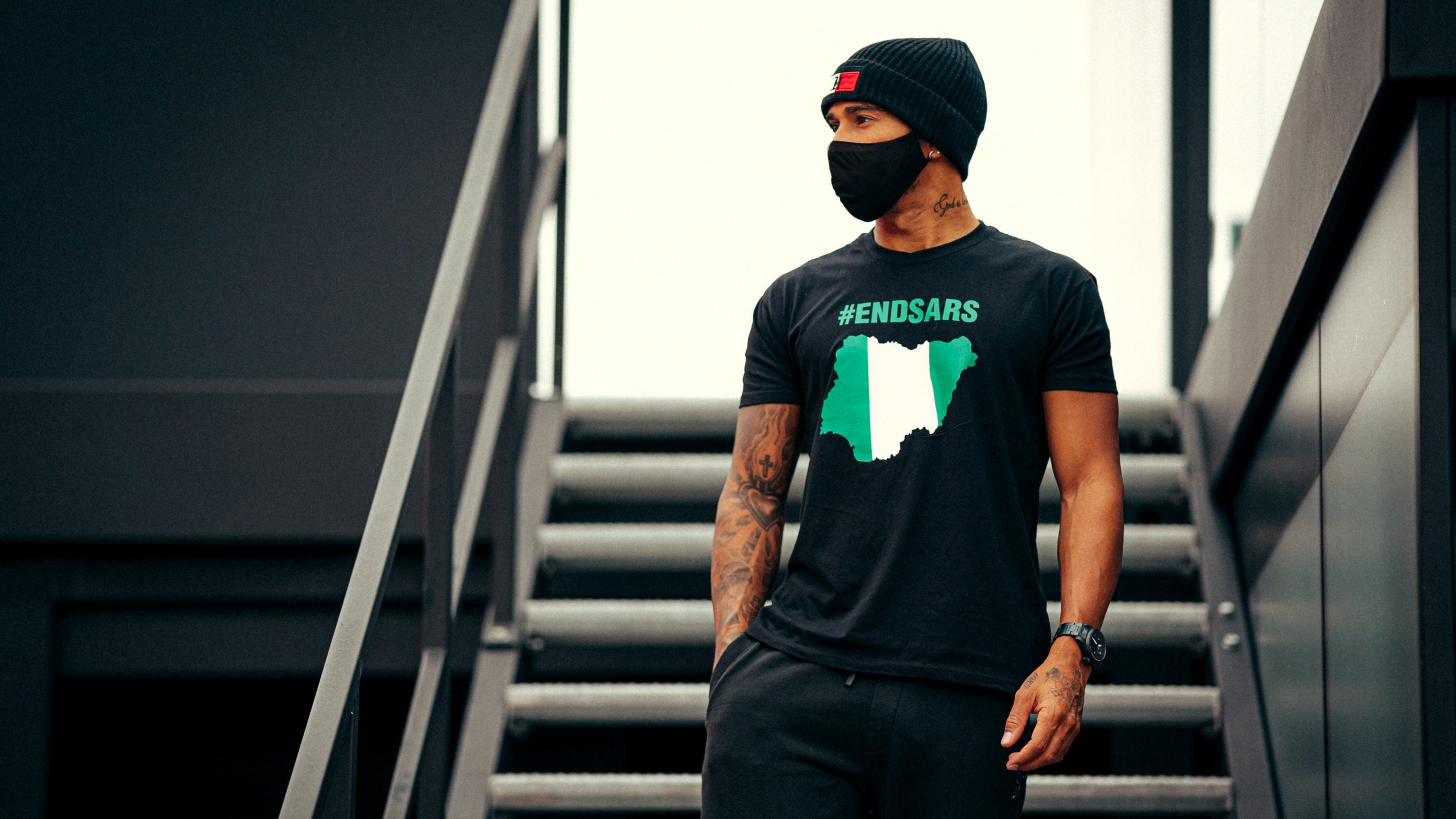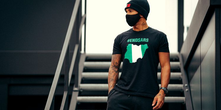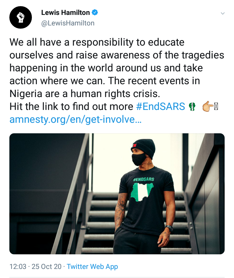 Hamilton posted a photo of him wearing a black T-shirt with the inscription #EndSARS and a map with the colour of the Nigerian flag. He however posted a link where people can sign up to demand an end to police brutality in Nigeria.