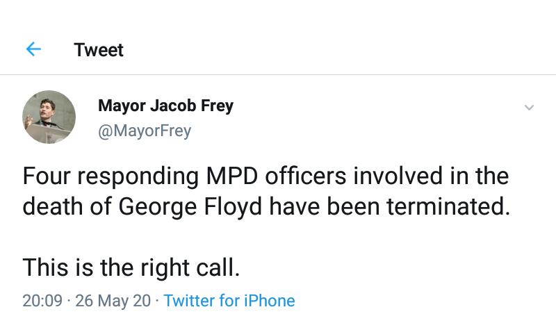 Frey tweeted: “Four responding MPD officers involved in the death of George Floyd have been terminated. This is the right call.”
