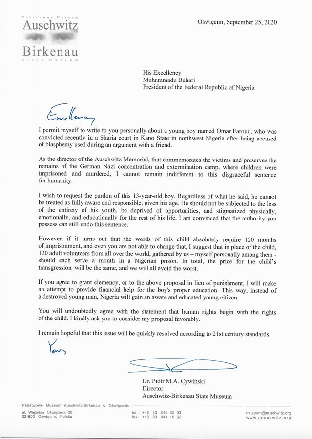 Piotr Cywinski, Director of Auschwitz Memorial in Poland has written a letter to President Muhammadu Buhari over the 10 year jail term verdict on 13-year-old Umar Farouq over blasphemy in Kano.