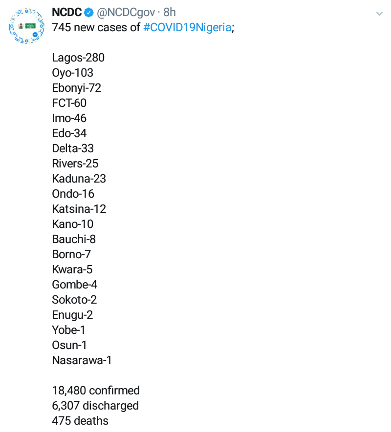 Nigeria on Thursday recorded her highest single-day cases of COVID-19 following Nigeria Centre for Disease Control’s confirmation of 745 new cases in 20 states and the Federal Capital Territory. That brings the total number of confirmed cases to 18,480.