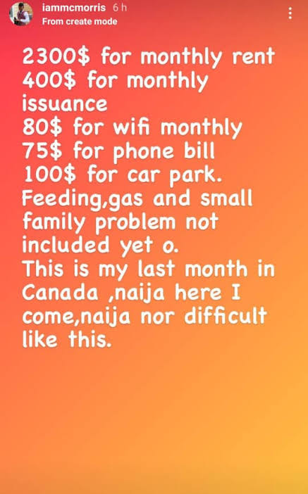 MC Morris announced this via a post shared on his Instastories. He made it known that he pays a huge amount of money for the basic amenities in Canada and revealed that it was his last month in the country.