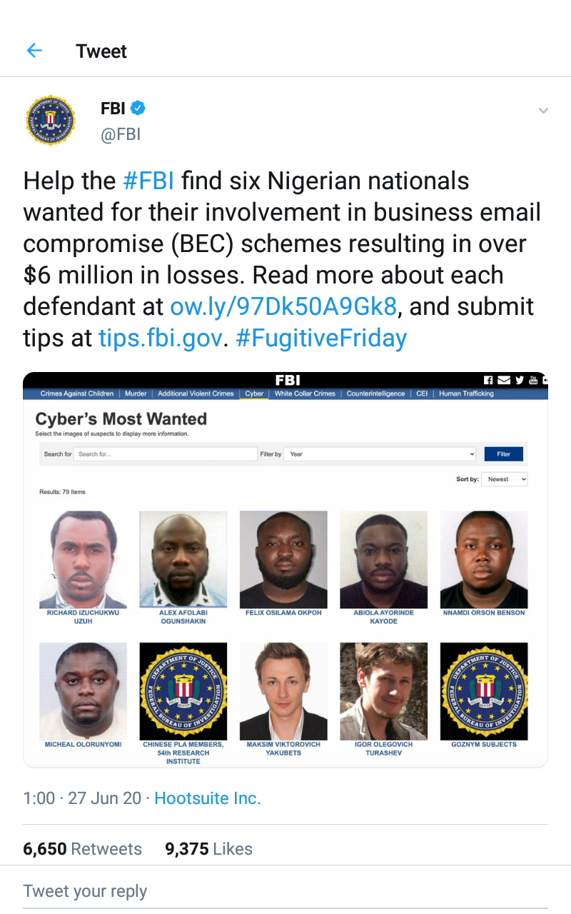 On Friday, the FBI posted images of the 6 Nigerians on their wanted list on Twitter and wrote: “Help the #FBI find six Nigerian nationals wanted for their involvement in business email compromise (BEC) schemes resulting in over $6 million in losses. Read more about each defendant at https://t.co/Q1OToaIVsl, and submit tips at https://t.co/iL7sD5efWD. #FugitiveFriday