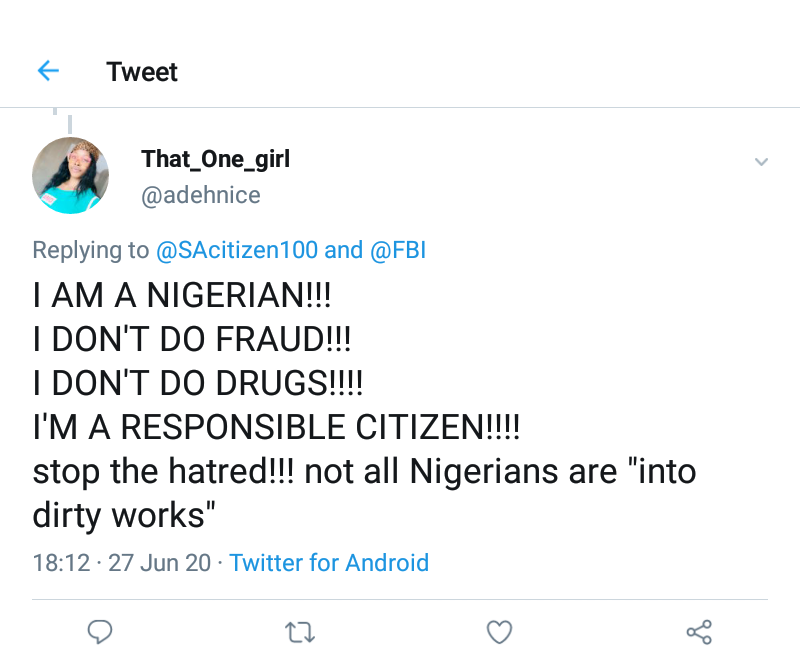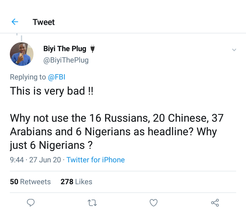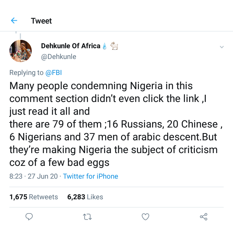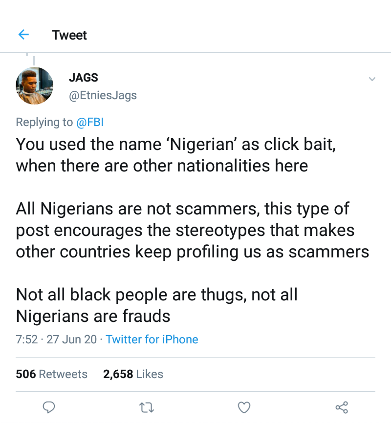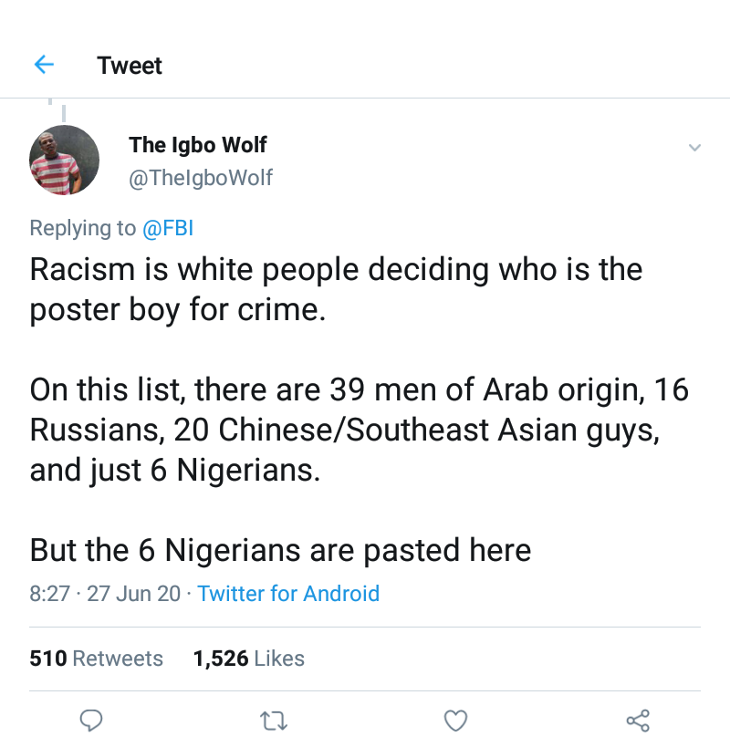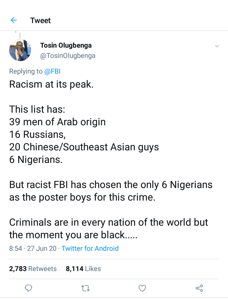 Nigerians have reacted on Twitter and attacked the FBI for continuing to advance the stereotype that Nigerians are the only fraudsters wanted by the Bureau.