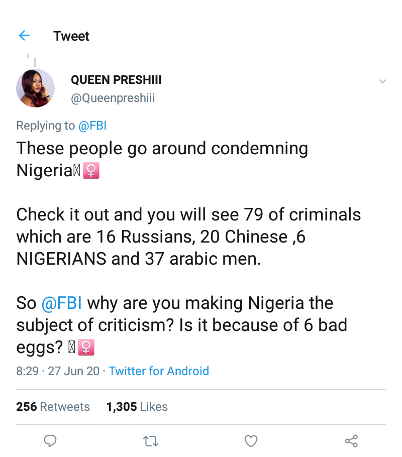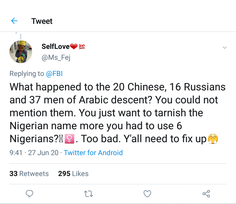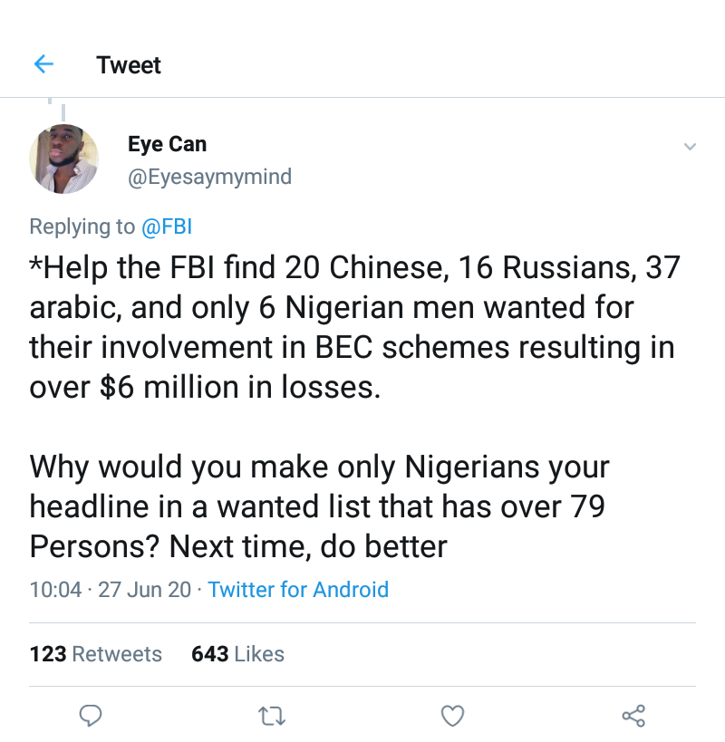 Nigerians took to Twitter to condemn the Federal Bureau of Investigation (FBI) for a tweet where the Bureau concentrated on the 6 Nigerians that are wanted for scam on a list that has more suspects from other countries.