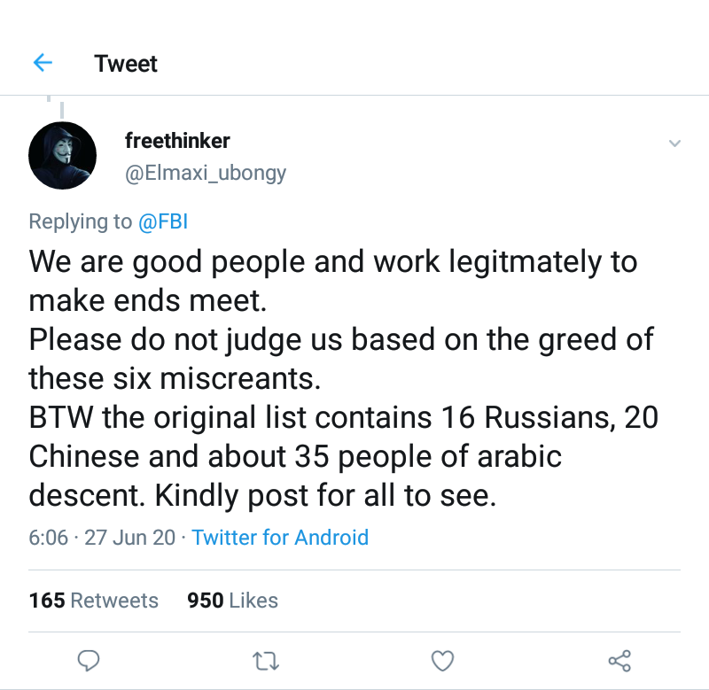 However, there are 20 Asians, 39 Arabs, 16 Russians and more on the full wanted list and the FBI did not even mention them and their countries despite the fact that they have higher numbers. The Bureau only concentrated on the 6 Nigerian scammers and this infuriated Nigerians.