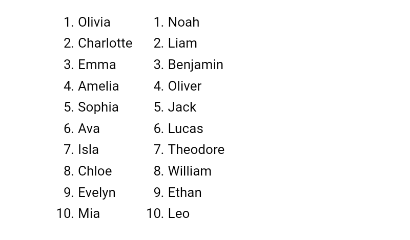 The top baby names in Ontario for 2020 were Olivia and Noah. Olivia has now been the top baby girl name in Ontario for over a decade, with 11 consecutive years in the number one spot. Charlotte also continues as the second-most popular name for girls. Noah took the top spot as the most popular name for boys for the second year in a row, with Liam following closely behind. This year we also welcome Isla, Theodore, and Leo to the top 10.