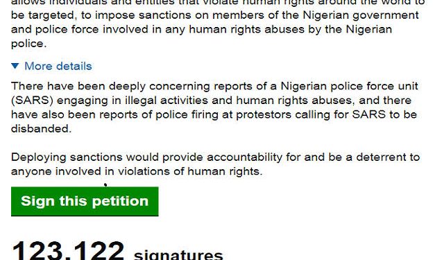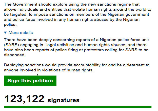 As at 7:00am on Wednesday October 21, over 100,000 people had signed the petition. The petition titled “Implement sanctions against the Nigerian Government and officials” read: “The Government should explore using the new sanctions regime that allows individuals and entities that violate human rights around the world to be targeted, to impose sanctions on members of the Nigerian government and police force involved in any human rights abuses by the Nigerian police.