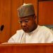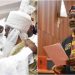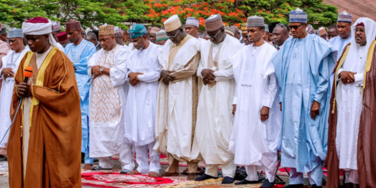 President Muhammadu Buhari with Chief Imam Captain Yusuf, Chief of Army Staff Lt Gen. TY Buratai, Leader of House Femi Gbajabiamila, Senator Kabiru Gaya and IG of Police Adamu Mohammed attend Eid El Filtri Prayers at the Mabilla Barracks Eid Praying Ground in Abuja.