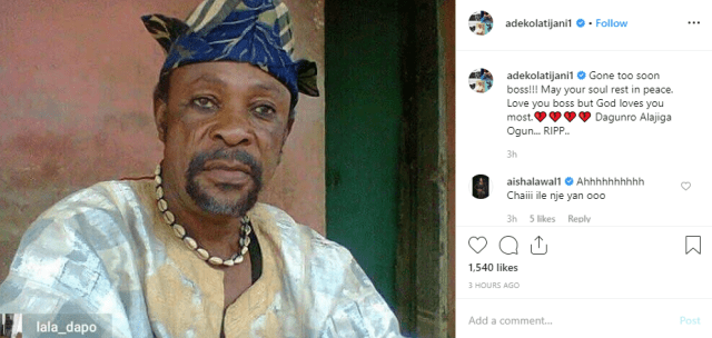 Actor, Adekola Tijani aka ‘Kamilu Kompo’, broke the news of the death of the veteran actor via his IG page, saying;