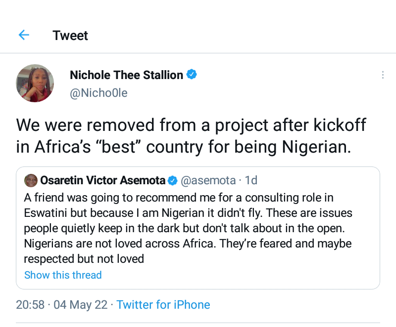 While replying, she tweeted: “We were removed from a project after kickoff in Africa’s “best” country for being Nigerian.”