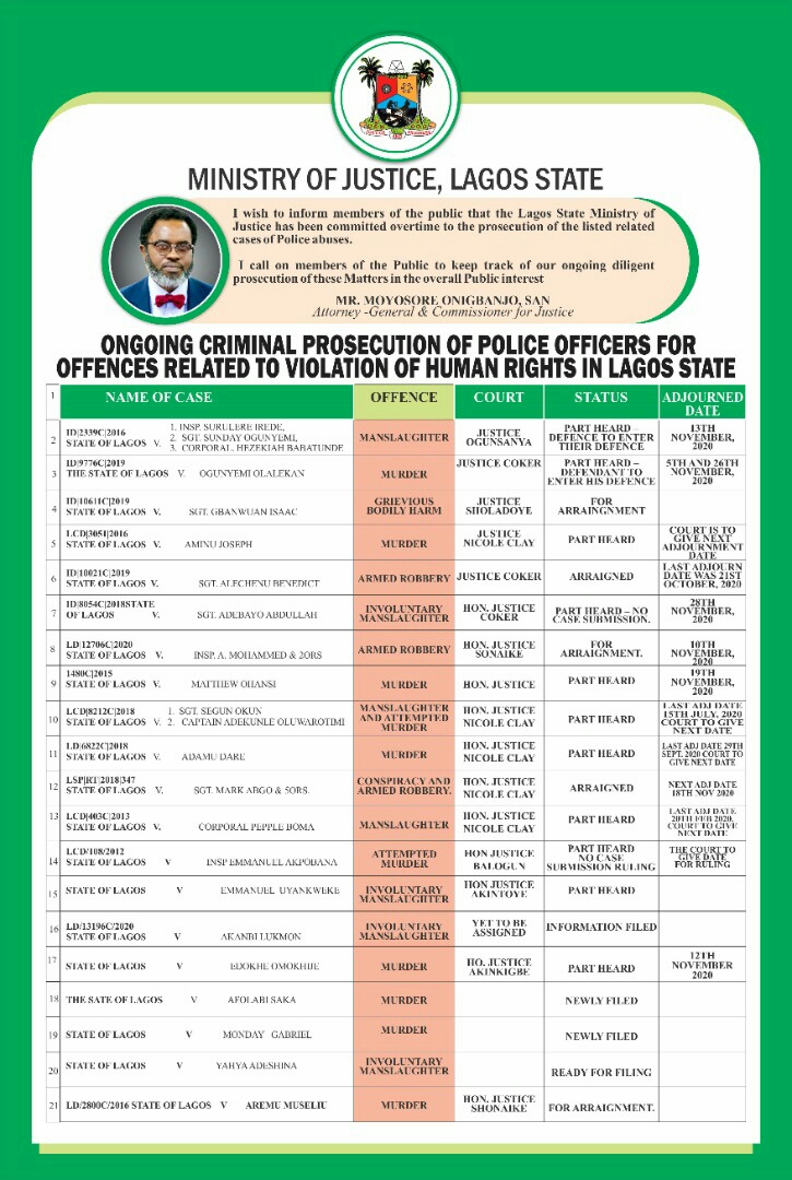 “To show our commitment to the latter, here is a list of ongoing prosecution of police officers for offences related to the violation of human rights in Lagos.