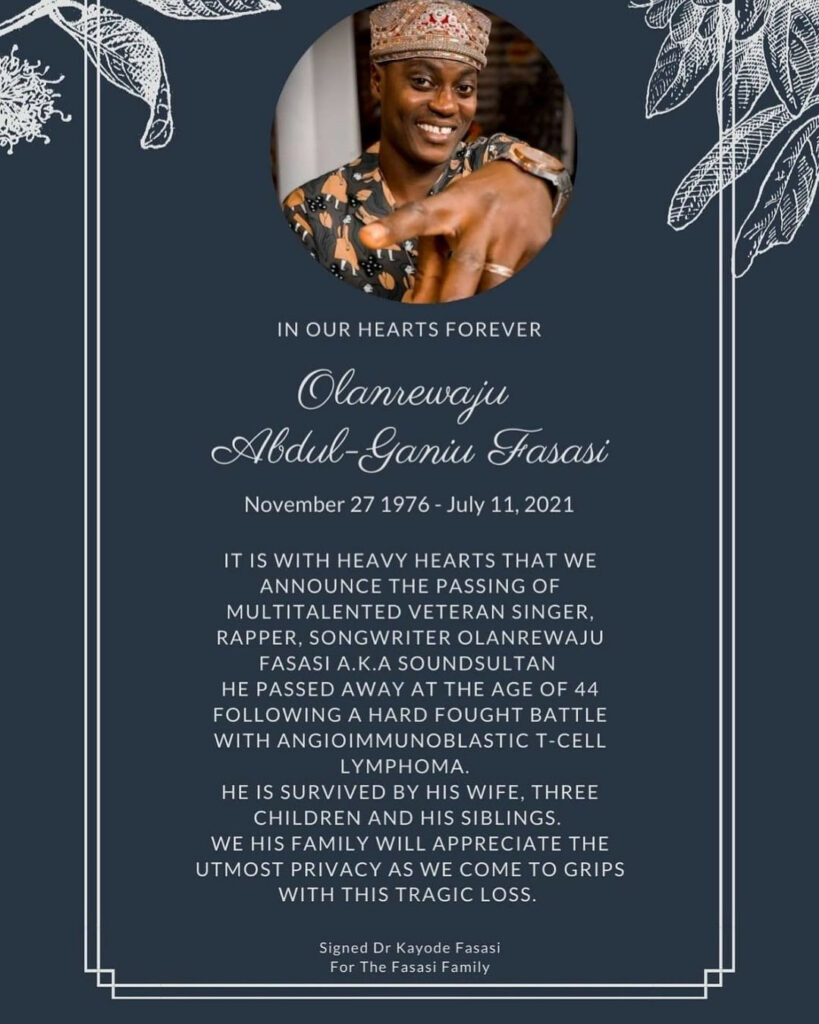 Famous Nigerian Singer, Olanrewaju Fasasi, also known as Sound Sultan, has died. A statement issued by his family reveals he died on July 11, 2021 after a protracted battle with throat cancer. He is survived by his wife and three children.
