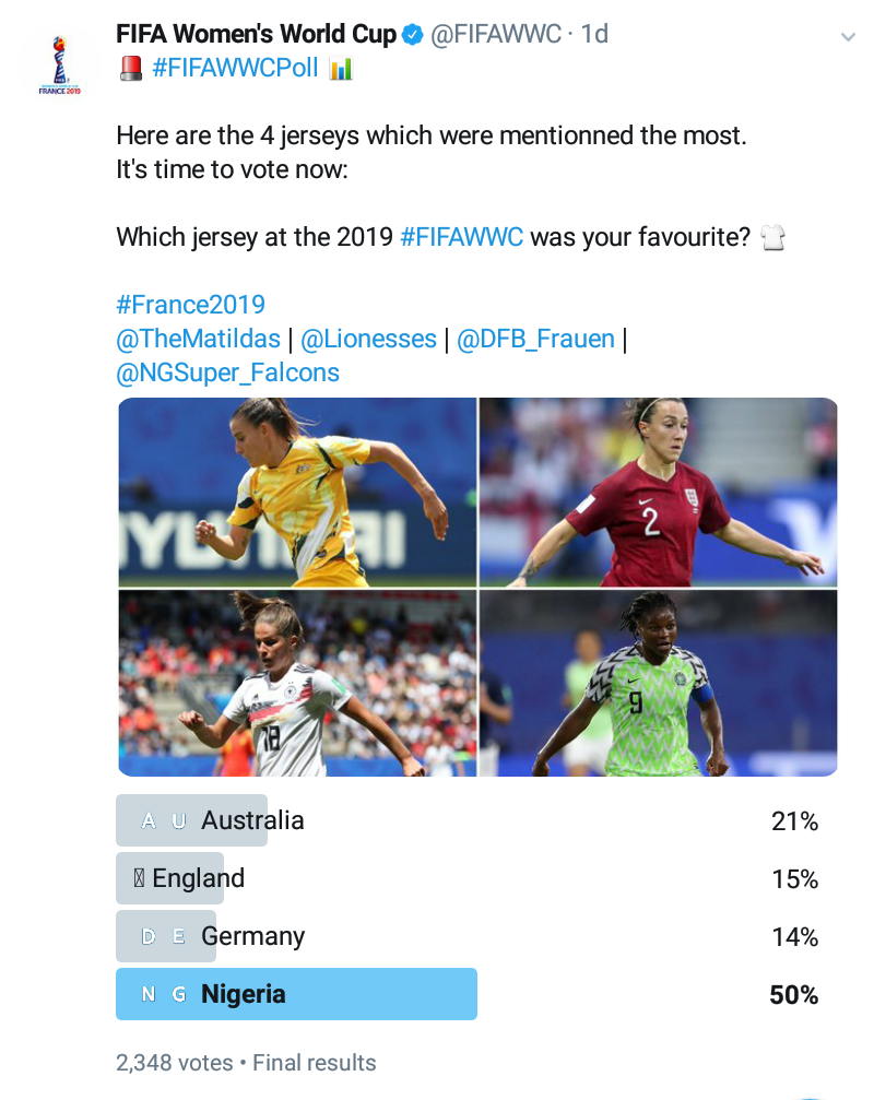 Super Falcons’ home jersey at the FIFA 2019 Women’s World Cup has been voted as the tournament’s best jersey.