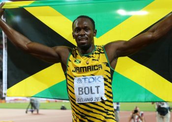 Jamaican athlete , Usain Bolt who is the only sprinter to capture the 100- and 200-metre track titles at three ...