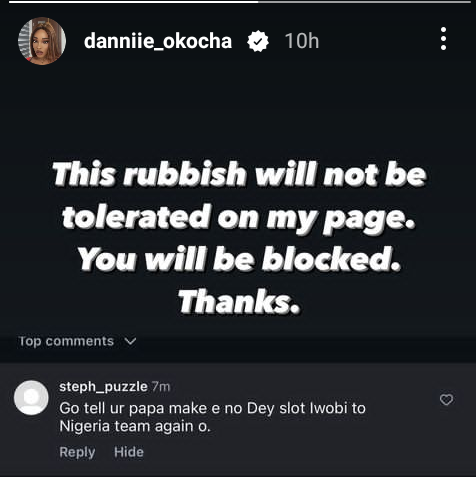 Daniella issued the warning in a recent Instagram post when she shared a screenshot of a comment, which stated that she should tell her father not to ‘slot Iwobi to the Nigerian team again’