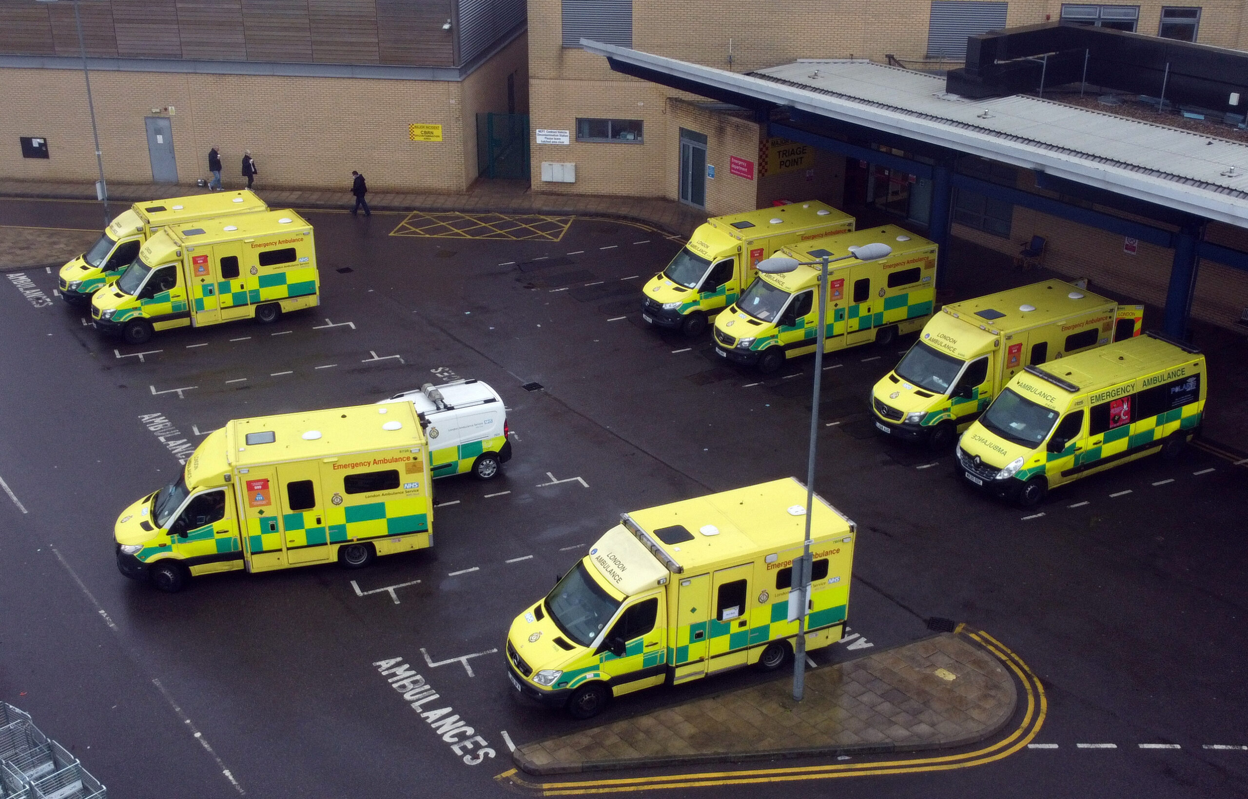 FILE PHOTO: Ambulances are seen parked outside of the Queen's Hospital in Romford, amid the spread of the coronavirus disease (COVID-19) pandemic in London, Britain, January 11, 2022. Picture taken with a drone. REUTERS/Hannah McKay