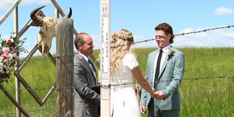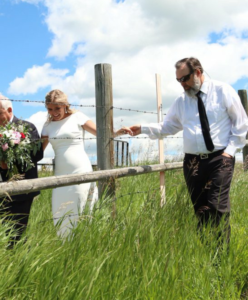 The wedding took place at the Canadian side of the border with Kadee’s dad Randy walking her down the “aisle” through a barbed wire fence line.