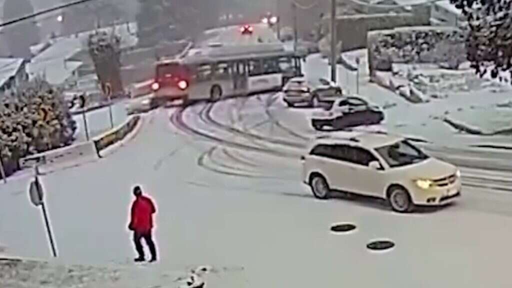 A video posted online, which looked to have been recorded on Laurentian Crescent in the city, reveals a bus approaching a snowy intersection.