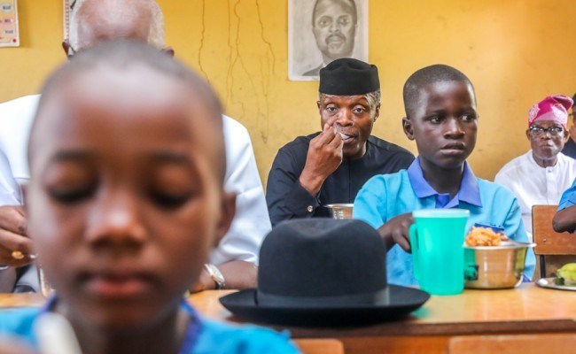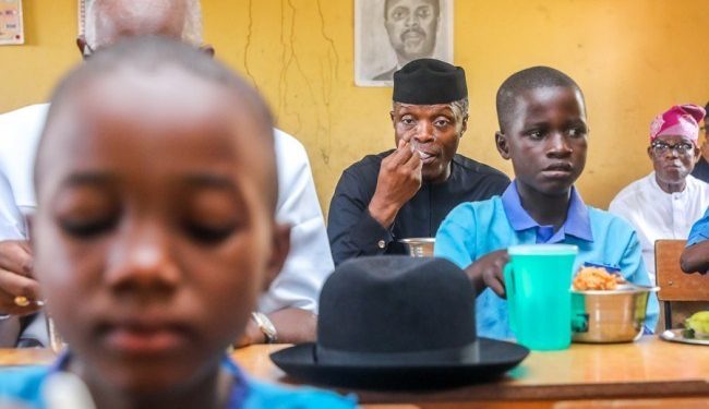 Vice President Yemi Osinbajo has stated that pupils of public schools are being fed by the Federal Government with 594 cattles, 138,000 chickens, 6.8million eggs and 83 metric tons of fish every week.